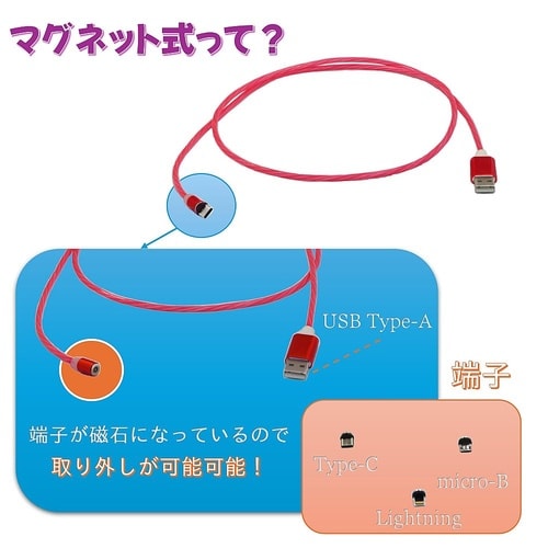強力なマグネット吸引で、簡単かつ確実に出力プラグを交換するタイプの3in1のUSBケーブルです。急速充電ケーブルです。交換用出力プラグ3個付属。電源に接続するとケーブルが発光します。 |