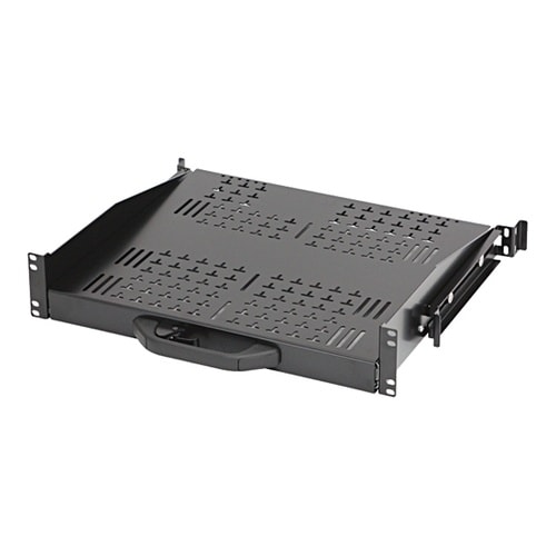 19インチマウント型のスライド可能な収納棚です。ハンドル部のツマミを握ることによってロックを解除し、棚をスライドさせることができます。スライドさせた棚は、全開、全閉、中間位置でロックを掛けることができ |