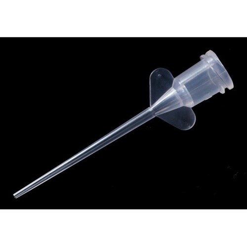 先端がフラットカットの極細ノズル付きメスルアーアダプターです。非金属のため、ノズルを極細チューブに差し込めばオール樹脂のチューブラインが形成できます。また柔軟性ノズルは狭い場所や各種ディスペンス作業に