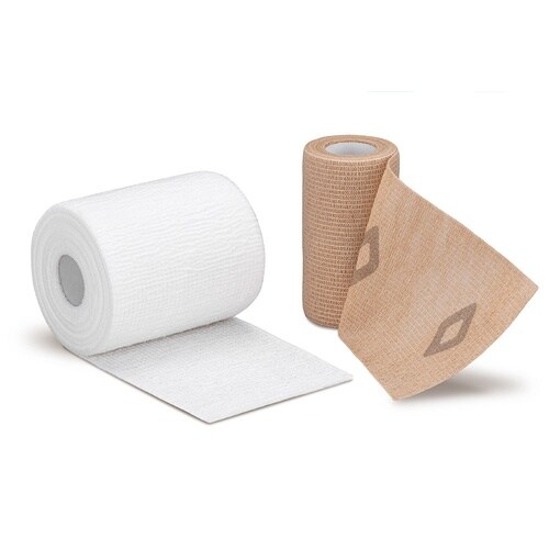 異なる伸縮性と自着性をもった2層の包帯で、安定した圧迫圧を維持する自着性包帯キット。インナーに片面自着性・弾性糸を用いたショートストレッチのパディング包帯、アウターに両面自着性のロングストレッチのガイ |