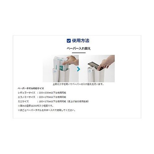 スッキリデザインで省スペースに設置可能!!ペーパーを取り出す時に手を濡らしている水が次のペーパーへ付くことがほとんどない為、常に清潔に使用できるPTH200。 |