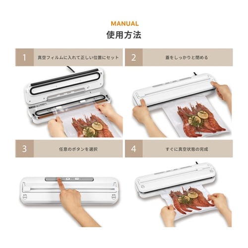 食品保存に適したバキュームシーラー。湿気や虫、酸化から守り鮮度を保ちます。フィルムに入れたらセットしてボタンを押すだけで簡単に真空状態を作成でき、食品保存だけでなくさまざまなシーンで活躍します。密封し |