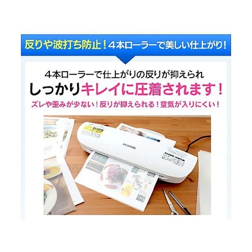 4本のローラーで波打ちが少なく、より高画質で美しい仕上がりを実現するラミネーターです。用紙につやと張りを出し、水や汚れからしっかりガードします。紙詰まりを防ぐオートリバース機能付き。切り忘れを防ぐ自動 |