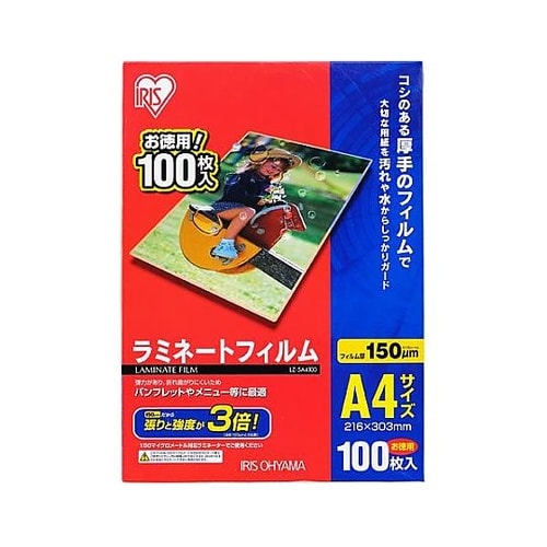 仕上がりのコシが強く、折れ曲がりに強い、厚さ150ミクロンのラミネートフィルム100枚セットです。用紙にツヤと張りを出し、水や汚れからしっかりガードするラミネートフィルムです。厚みがあるため、コシが強 |