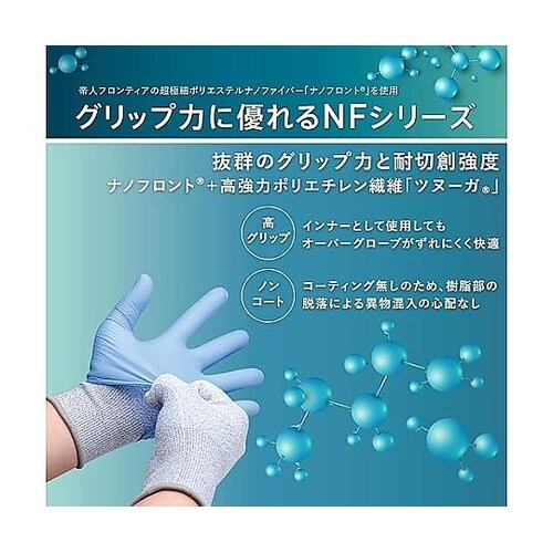 抜群のグリップ力と耐切創強度 ナノフロント(R)+ポリエチレン繊維「ツヌーガ(R)」を使用。衛生面から下履きとしての使用をおすすめします。高グリップ:インナーとして使用してもオーバーグローブがずれにく |