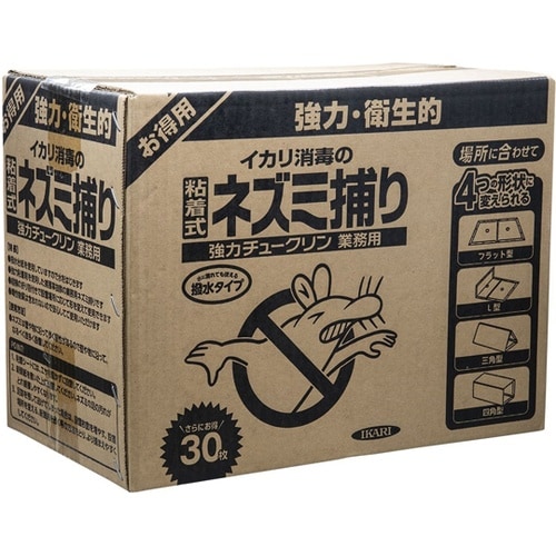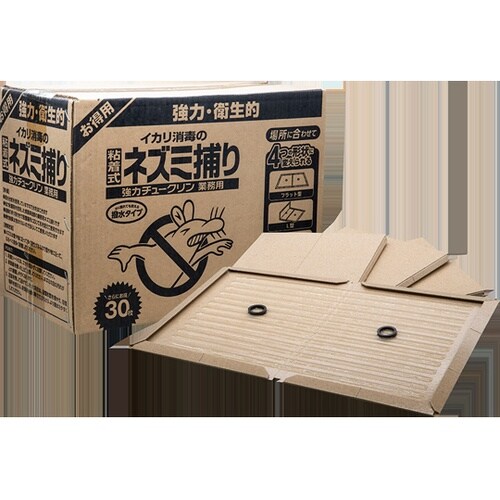 強力・衛生的!水に濡れても使える撥水タイプ。変形・開閉が簡単なフラット台紙を採用。撥水台紙を使用していますので水をはじきます。強力粘着剤を使用した捕獲率バツグンの業務用ネズミ捕りです。縦横の折り目付き |