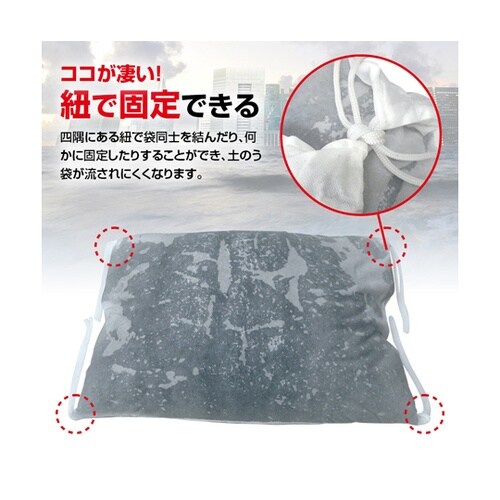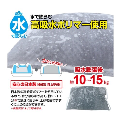 土や砂を使わずに水だけで膨らみます。1袋につき約10Lの水に浸してもみほぐします。約10分程度で吸水し、約10−15Kgの土のう袋になります。四隅に紐が付いているので、何かに固定したり、土のう袋同士と |