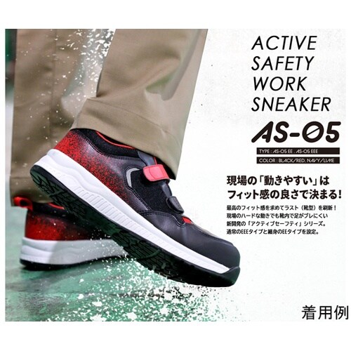 JSAA A種認定 アクティブセフティ ワークスニーカー AS−05 細身設計(ワイズEE) ブラック/レッド 22.5cm