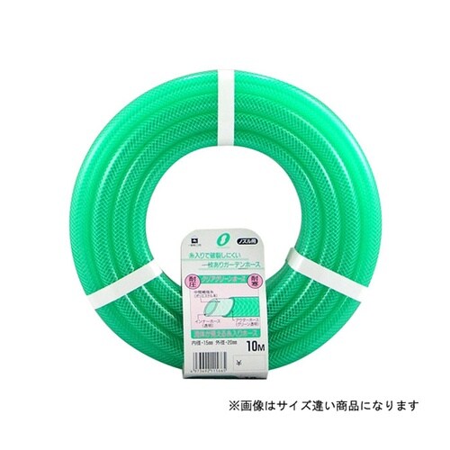 液体が見えるライトグリーンカラーの耐圧ホース。家庭用給水用具、家庭用散水用具として。 |