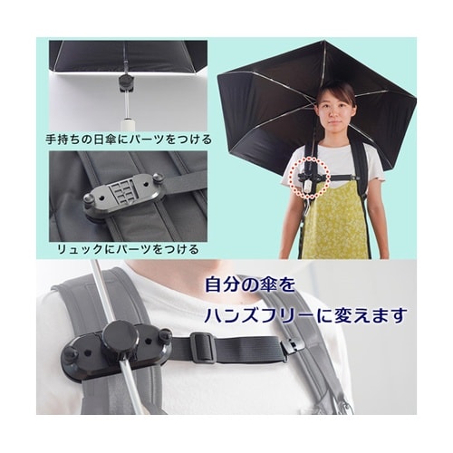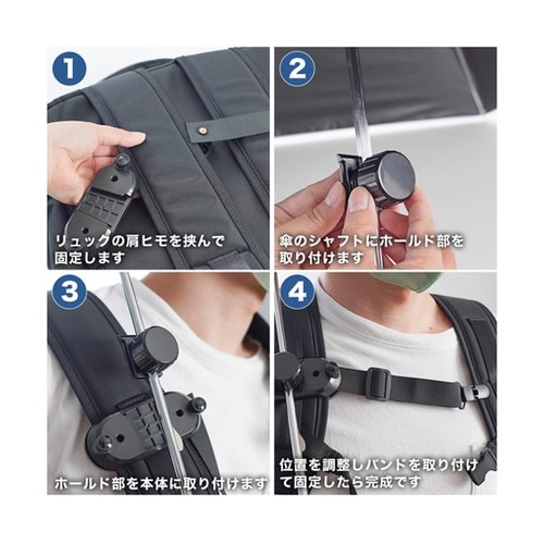 手ぶらで傘が差せるから両手が自由に。傘をハンズフリーにするリュックにつけるアタッチメント |