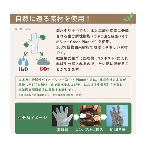 土でも海水中でも生分解される樹脂でできているので地球環境にやさしい手袋です。この手袋は100%植物由来樹脂(カネカ生分解性ポリマーGreenPlanet(R))を使用しており、地球温暖化対策にも貢献し |