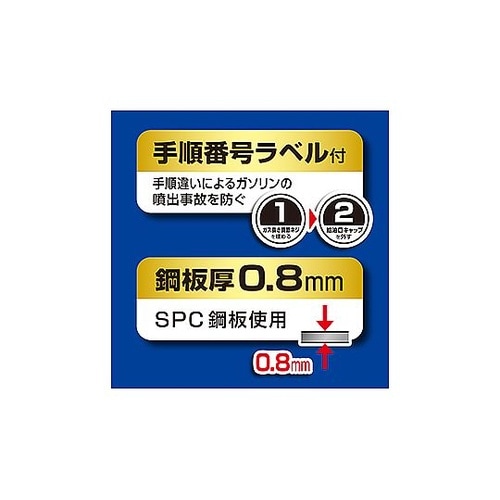消防法適合品、UN規格適合品農機や建機などのガソリン補充用に給油手順違いによるガソリンの噴出事故を防ぐ手順番号ラベル付丈夫な金属製給油ノズル口金給油時に注ぎやすいように底面形状を工夫内容物の揺れを抑え |