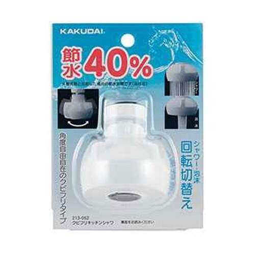 泡沫とシャワーの切替え。取付ネジW22山20。クビフリ機能付右で25°まで調節可能)。整流器に比べて約40%(カクダイ比)の節水効果があります。使用温度:1−60℃。パッキン付き。 |
