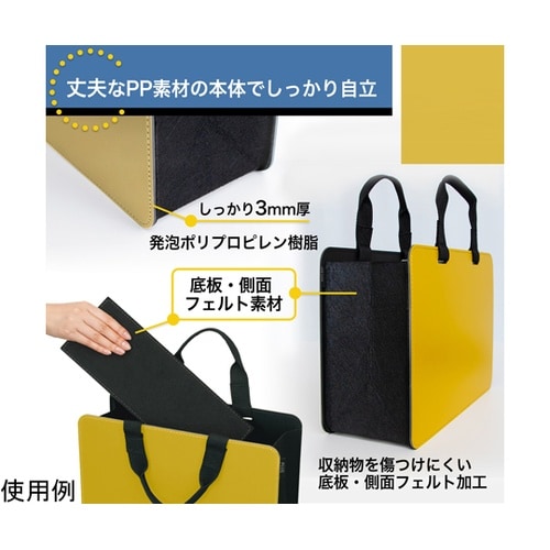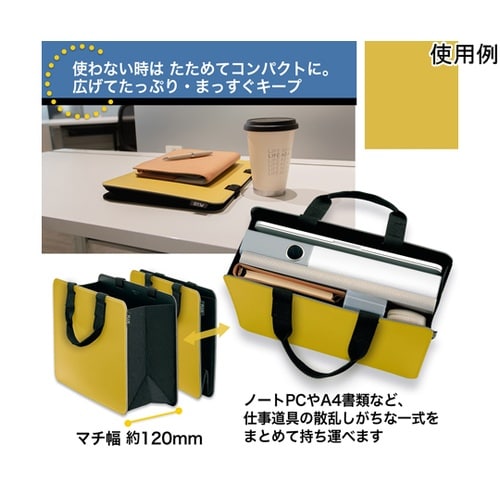 オフィス内の移動時や、リモートワーク時に散乱しがちな仕事道具一式をまとめて収納できる、持ち運びに便利なバッグ丈夫で軽い、厚みのある発泡PP素材を採用しっかりと自立するためロッカーやデスクで倒れにくく、