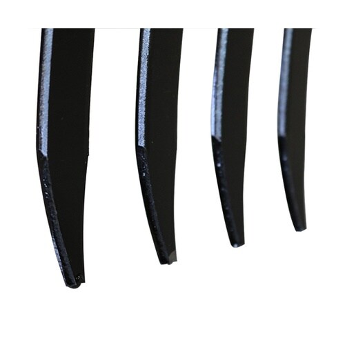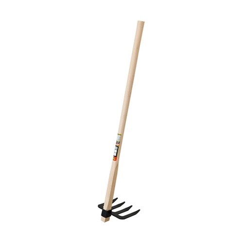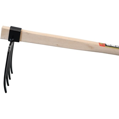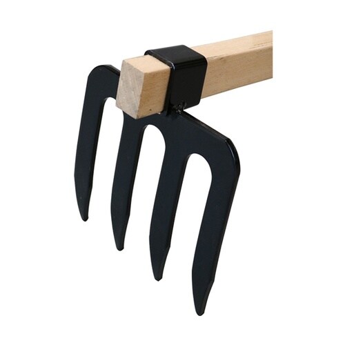 頭部(かき寄せ部)はスチール製四本爪タイプ、かき寄せ作業に適しています。頭部に焼入れ(強度が上がる、磨耗に強くなる)・焼戻し(弾力性が上がる)の熱処理を行っています。頭部と柄部の取り付けはクサビを必要 |