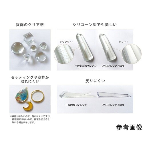 UV−LEDライト(405nm)でもUVライト(36W)でも硬化する1液性レジン。時間がたっても黄変しにくい。抜群のクリア感。シリコーン型でもシワシワになりにくい。UV−LEDライトで1−2秒で硬化が