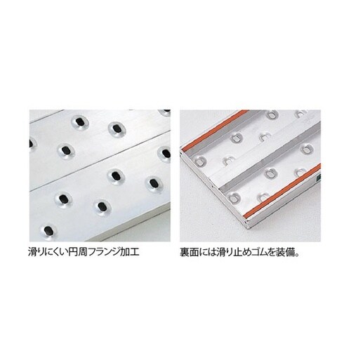 表面は円周フランジ加工の滑り止めを施し、裏面には滑り止め用のゴムも装備した足場板です。(メーカー足場板中最軽量)仮設工業会認定の足場板・2点支持 |