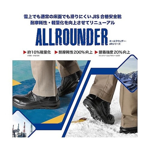 雪上+オールシーズン型JIS合格安全靴。雪上でも通常の床面でも滑りにくい安全靴「オールラウンダー」が耐摩耗性と軽量性を高めリニューアル。屋内外でオールシーズン活躍します。雪上で滑りにくい靴底意匠をソー |