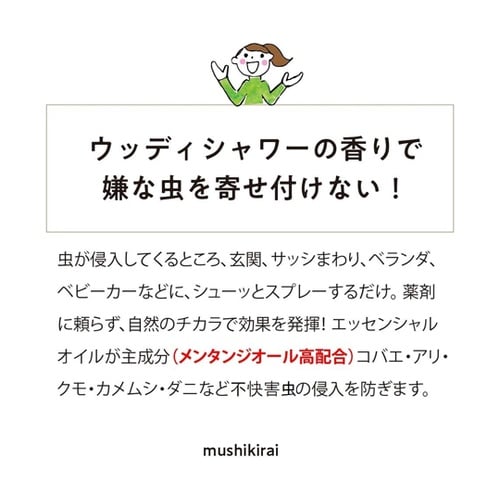 家の中に虫が入ってきそうなところにシューとスプレーするだけで侵入を防ぎますエッセンシャルオイル主成分(メンタンジオール高配合)で安心処方コバエ、アリ、クモ、カメムシ、ダニなど不快害虫の侵入を防ぎます。 |