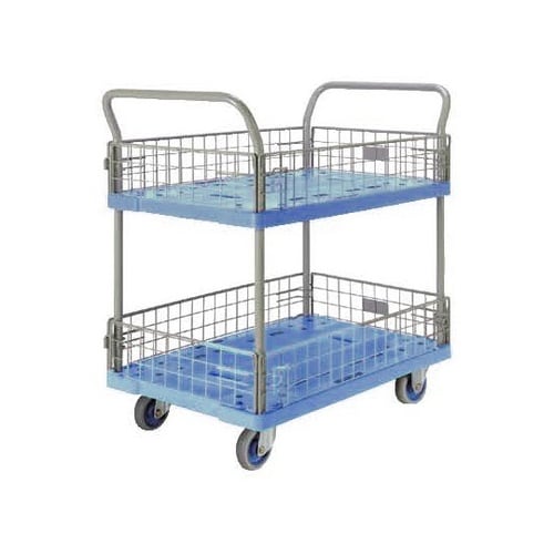 軽くて使いやすい樹脂製台車。デッキ及びキャスターヨークは樹脂製のため錆びる心配がありません。ピッキング作業や薬品庫での仕分けにも便利な2段タイプ。またこぼれ止め付で移動時の搬送物落下を防止します。ハン |
