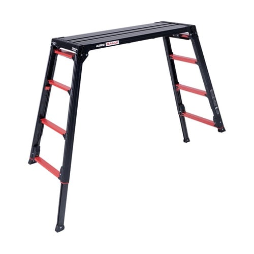 上部操作式伸縮脚付足場台伸縮脚の調整を立ったままできるという進化と止め金具の自動ロック化による安心感を併せ持った新型足場台が赤と黒のコントラストで登場。※操作レバーは全サイズ天板の下 |