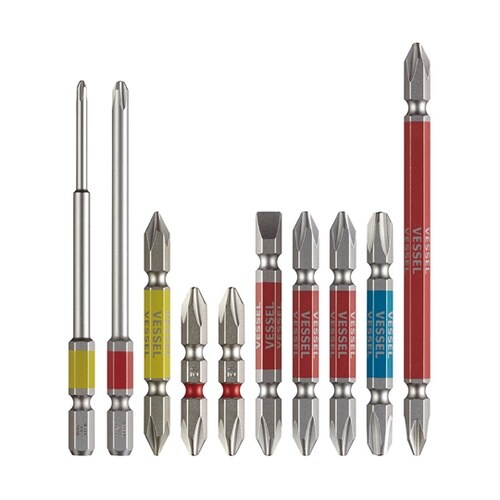 ビット新材料ダイハード鋼:強さと粘りが違う。サイズを色分け:はがれにくい防錆塗装。ビットベルト:10本のビットを収納持ち運びや収納に便利。片頭ビット:軸部が丸いのでワークに傷をつけにくく狭い場所の作業 |