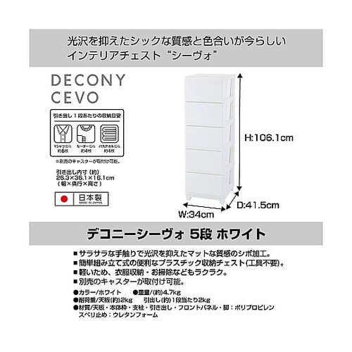 光沢を抑えたマットな質感とシックな色合いが今らしい、インテリアチェスト デコニー”シーヴォ”。光沢を抑えたマットな質感。引出し1段あたりYシャツなら約6枚、セーターなら約4枚、バスタオルなら約4枚収納 |