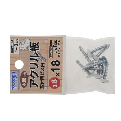材質は鉄でユニクロめっき。先端特殊形状の為、アクリル板へ下穴をあけなくても直接アクリル板を木に止める事ができます。通常のねじに比べアクリル板の割れが防げます。アクリル板(板厚1mm−3mm)を木材に止 |