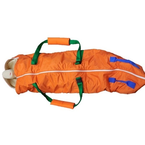 担架使用時に体を包み込む為運ばれている人が落ちる不安を解消できます。担架と寝袋を同時に使えます。 |