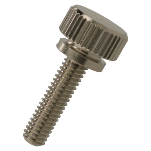 材質は黄銅で、ニッケルめっき。ねじ頭にローレット(ギザ)が入っているので手で締付けたり緩めたりできます。手締めで使用。調整ねじや取り外しを行う箇所などに使用できる。 |