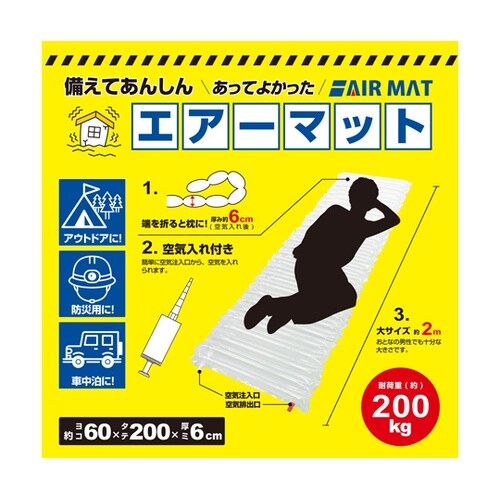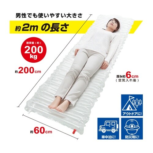 災害時の休息に適したくり返し使えるエアーマット災害時の休息に適したくり返し使えるエアーマットです。[サイズ]:約60×200×厚6cm[重さ]:約280g[材質]:PE、PA[耐荷重]:約200kg[ |