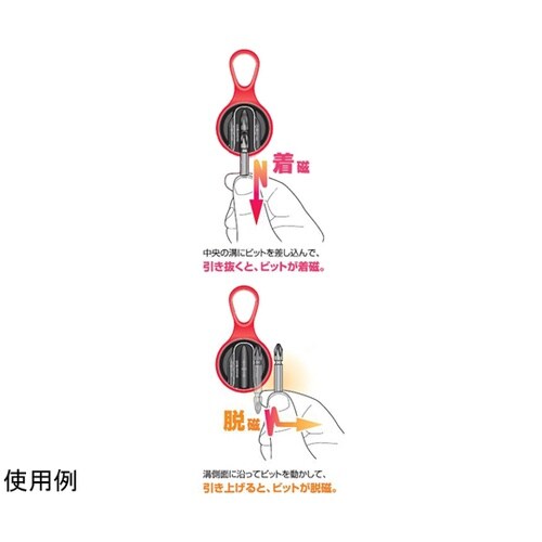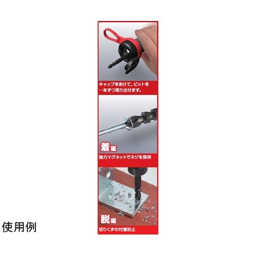 緩和×吸収効果でビットの跳ねや折れを抑制。キャップ部にマグネタイザーを内蔵、ビットの着磁、脱磁ができる。フックにかけられるリング付き。ボトルサイズ:53×100×111mm。 |