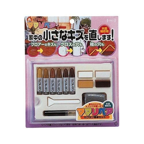 家中の小さなキズを手軽に補修。家中の小さなキズ・穴を補修でき、どなたでも手軽にできる補修キット。フロアや家具、ドア、建具等のひっかきキズ・小さな欠けキズに。柱、鴨居、クロス壁等のネジ穴。ビス穴の補修に |