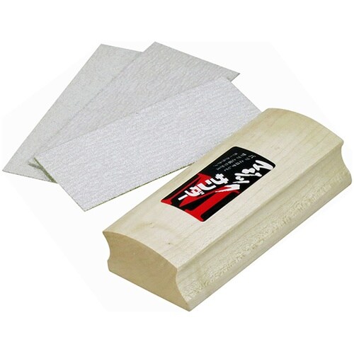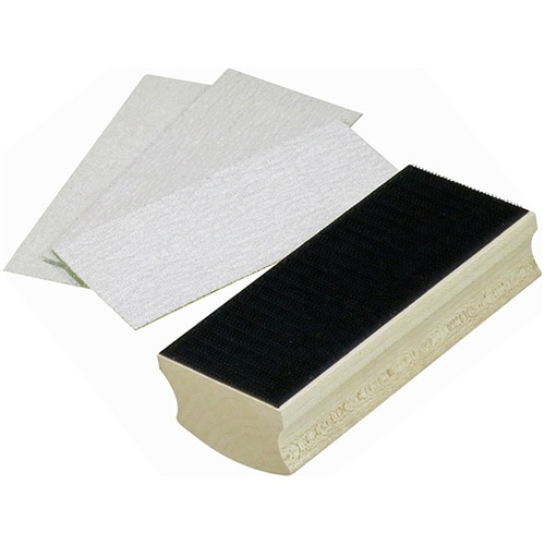 木台のやさしさとマジックテープのクッションで使いやすさ抜群。目づまり防止剤により通常の紙やすりより長持ちします。 |