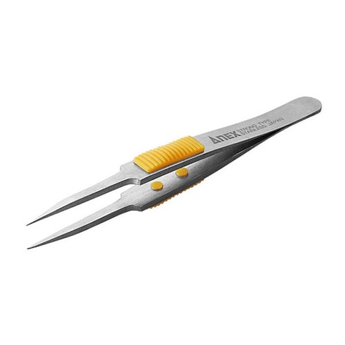 ピンセット先端に力が入り、物をしっかりつかむことができるラバーグリップ付。指先のすべりも防止します。 |