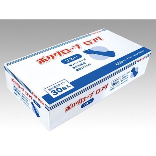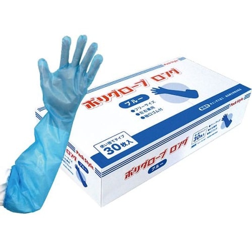 60cmのロングタイプ。左右兼用。異物混入対策に有効なブルーの輪ゴムを使用しています。手首部分から取り出しでき衛生的。 |