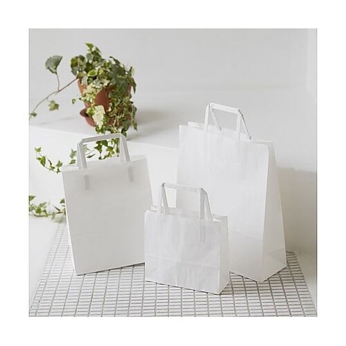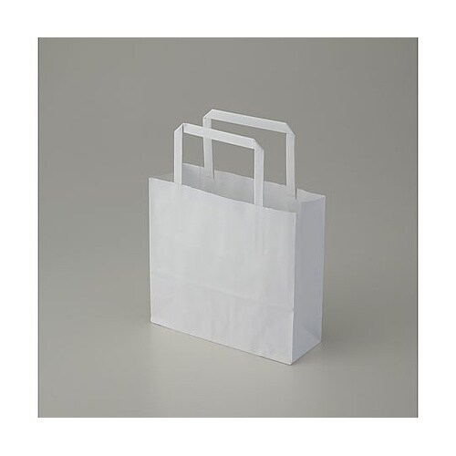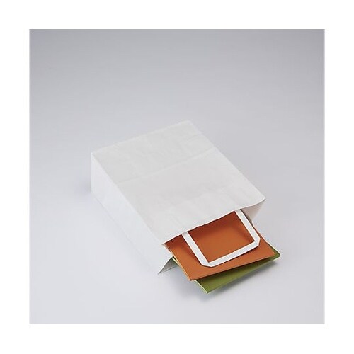 もっとも汎用性の高い、プレーンな白無地の手提げ袋です。表面に艶のない、晒クラフト紙を使用しております。25チャームバッグの中でも、容積が最小の規格です。紐は外に出た状態で包装してあります。 |