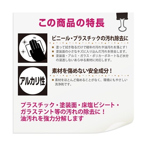 ハウスクリーニングのプロが「汚れた素材・場所の種類」、「汚れの原因」に応じて開発した高性能クリーナー。「驚きの洗浄力」でこれまで中性洗剤では落ちなかったビニール・プラスチック製品の汚れを落とします。研 |