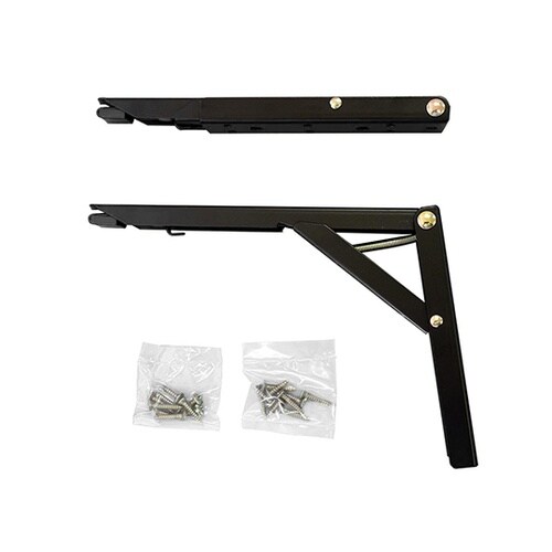 ワンタッチで折りたためるので、テーブルや棚受けをかんたんに開閉できます。開く時は棚板を90度以上持ち上げると自動でストッパーがかかります。たたむ時は棚板を少し持ち上げて、左右の金具の解錠レバーを同時に |