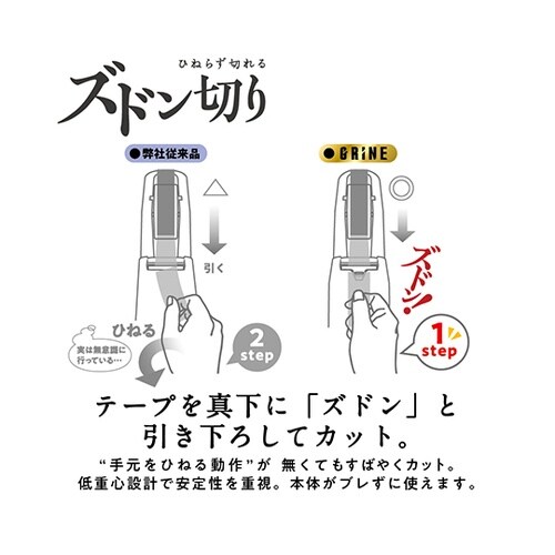 ひねらず切れるズドン切り 現場での作業効率UPに。軽い力ですばやく切れる 約50%軽減(弊社従来品比)軽い切れ味10万回持続!OPP/ストアテープも切りやすい(弊社従来品比)切り口まっすぐ らくカット |