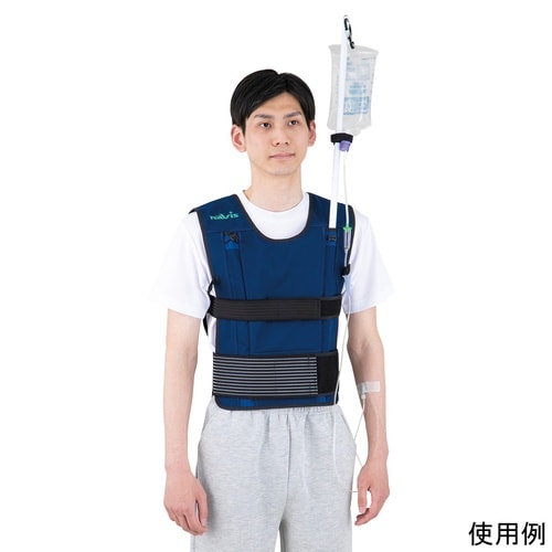 点滴時、点滴スタンドなしで自由に動くことができるベストです。ポールを収納するポケットが左右にあります。一人でも着用可能です。 |