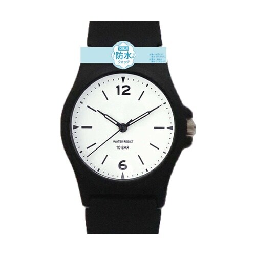 10気圧防水ウォッチ。PVC素材のバンドのため、汚れてもお手入れが容易です。日本製ムーブメント |