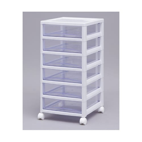 引出しの材質にスチロールを採用しているため透明度が高く、中身が確認しやすいクリアタイプのチェストです。引出しは飛び出しにくい、簡易ロック構造です。移動に便利なキャスター付きです |