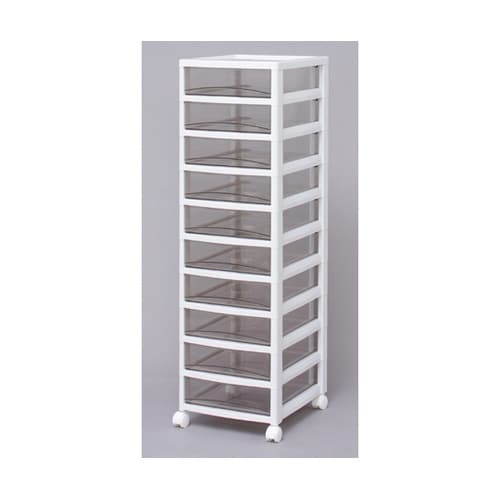 引出しの材質にスチロールを採用しているため透明度が高く、中身が確認しやすいクリアタイプのチェストです。引出しは飛び出しにくい、簡易ロック構造です。移動に便利なキャスター付きです