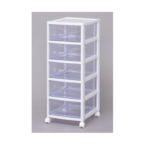 引出しの材質にスチロールを採用しているため透明度が高く、中身が確認しやすいクリアタイプのチェストです。引出しは飛び出しにくい、簡易ロック構造です。移動に便利なキャスター付きです |