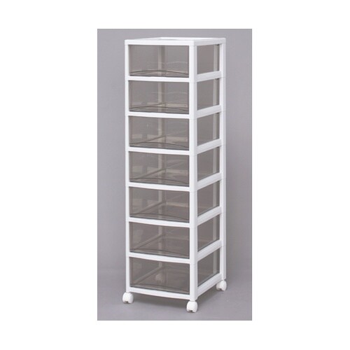 引出しの材質にスチロールを採用しているため透明度が高く、中身が確認しやすいクリアタイプのチェストです。引出しは飛び出しにくい、簡易ロック構造です。移動に便利なキャスター付きです |