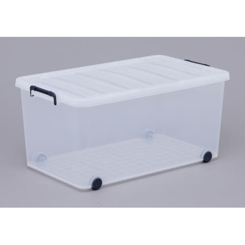 一般的な押入れに入る奥行きサイズのキャリーです。安定感のある下から留めるバックルを採用しています。フタには溝が付いているので、スタッキングが可能です。移動に便利なキャスターが付いています。 |