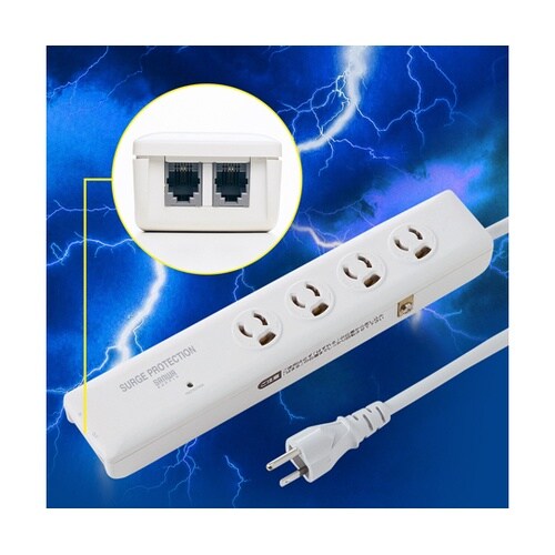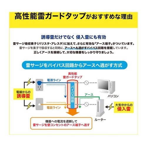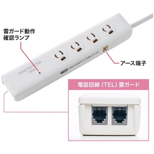 落雷により電源線や電話回線に侵入する誘導雷サージから、パソコンや通信端末機器が破壊するのを防止する防護機器です。コンセントにパソコン、通信端末機器の電源を差し込み、モジュラーコードを接続するだけで独自 |