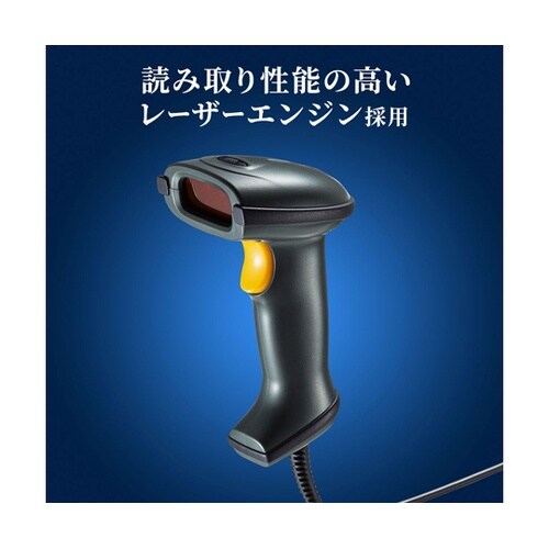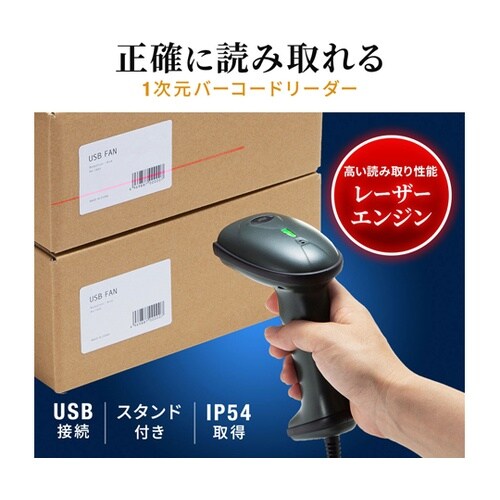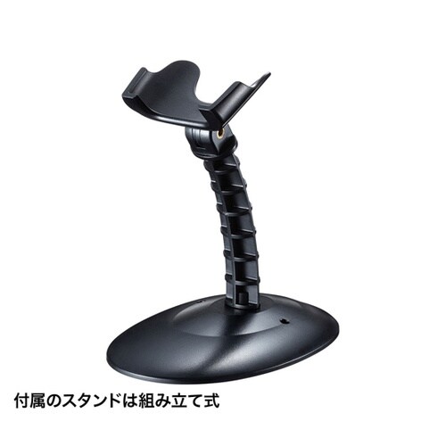 300スキャン/秒の読み取り性能で高速読み取りが可能です。レーザーセンサー搭載で、視認性、読み取り性が高く密集したバーコードの読み取りに向いています。付属スタンドを使うことでかざすだけで読み取りが可能 |