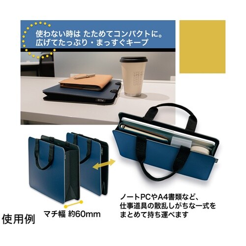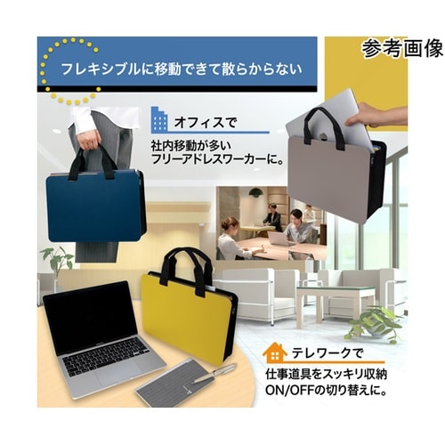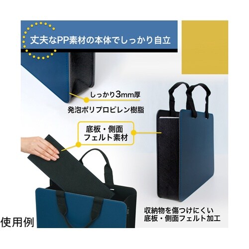 オフィス内の移動時や、リモートワーク時に散乱しがちな仕事道具一式をまとめて収納できる、持ち運びに便利なバッグ丈夫で軽い、厚みのある発泡PP素材を採用しっかりと自立するためロッカーやデスクで倒れにくく、